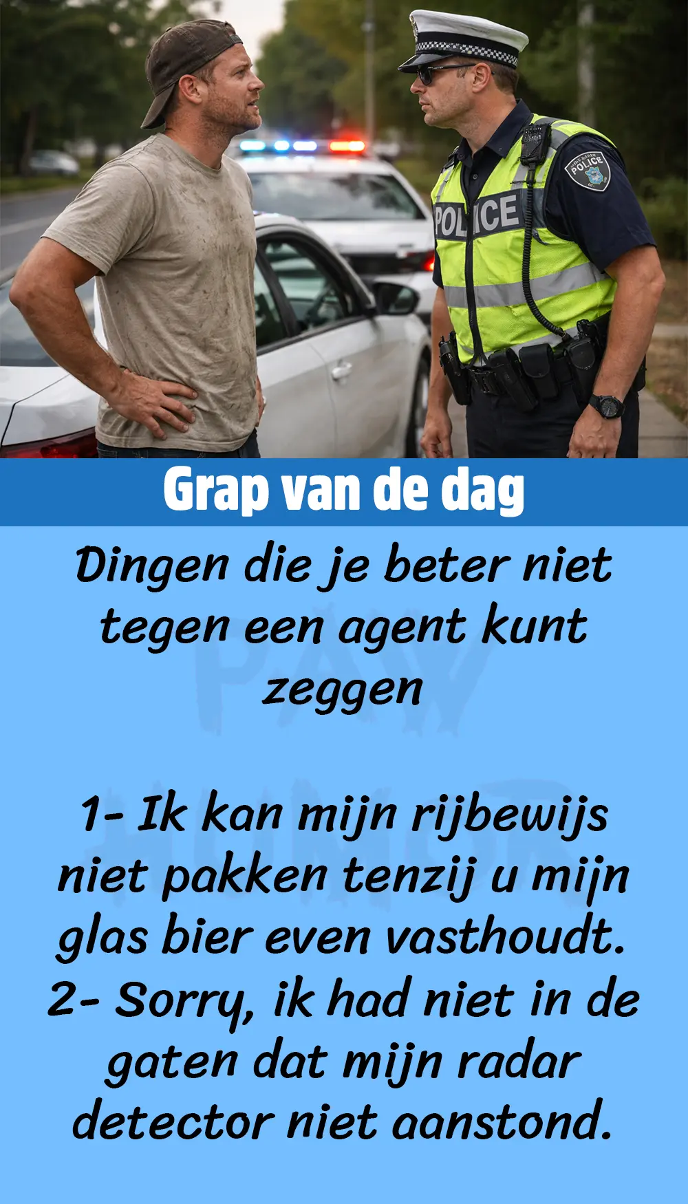 Agent: “Wat is de reden dat u zo hard reed?” Jij: “Je vrouw belde dat je net naar je werk was!”