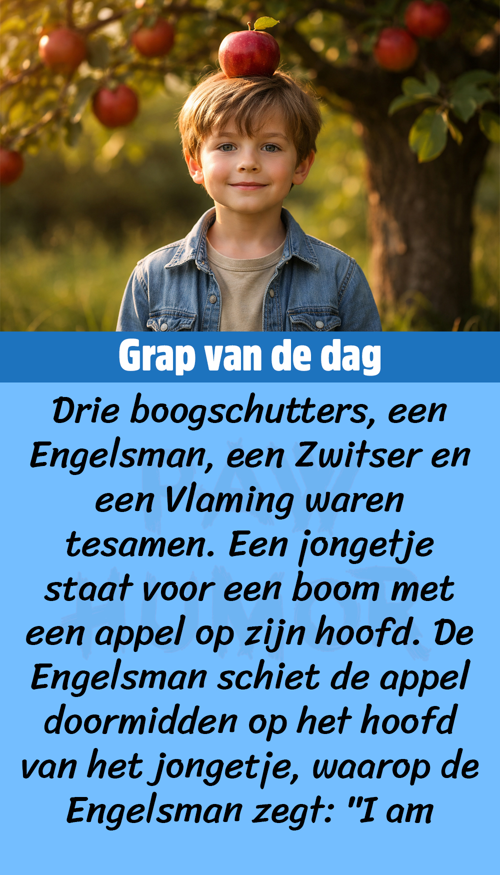 De Vlaming zet er ook een appel op, maar schiet natuurlijk vlak in het voorhoofd van dat jongetje. Waarop hij met een gezicht als van een kuiken dat pas uit het ei komt zegt: “I am Sorry”.