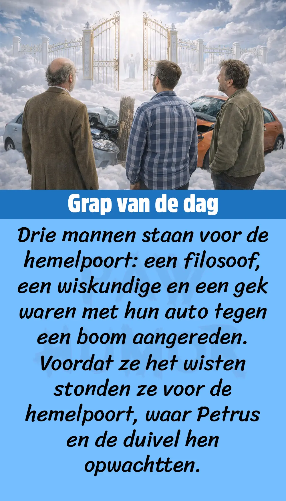 “Heren,” zo begon de duivel, “aangezien de hemel overbevolkt begint te raken, ben ik met Petrus overeengekomen om het aantal mensen dat de hemel mag binnengaan te beperken. Wanneer iemand van jullie mij een vraag kan stellen die ik niet kan beantwoorden, ben je het waard om naar de hemel te gaan en anders ga je met mij mee naar de hel.”