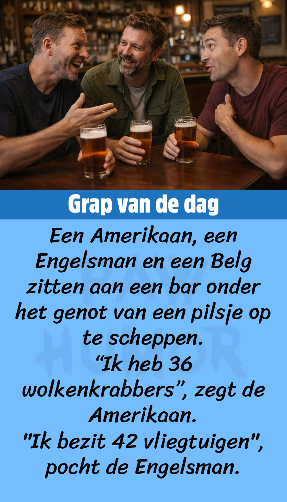 De volgende dag zitten de mannen weer aan de bar, zegt de Amerikaan: “Ik heb gisteren een beetje gelogen, ik heb maar 21 wolkenkrabbers.”