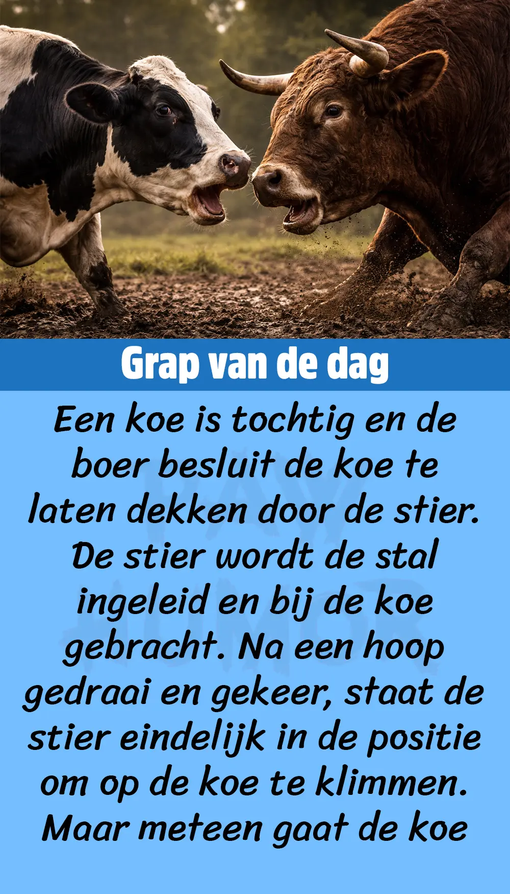 Zo gezegd, zo gedaan. Maar ook in de wei moet er veel gemanoeuvreerd worden voordat de stier weer achter de koe komt te staan. Zodra de stier de koe wil bespringen, gaat de koe weer op haar achterwerk zitten. Dan komt er een man voorbijfietsen, en die ziet dat tafereel zo eens aan. Op een gegeven moment zegt de man tegen de boer: “Die koe komt zeker uit Nijmegen?”