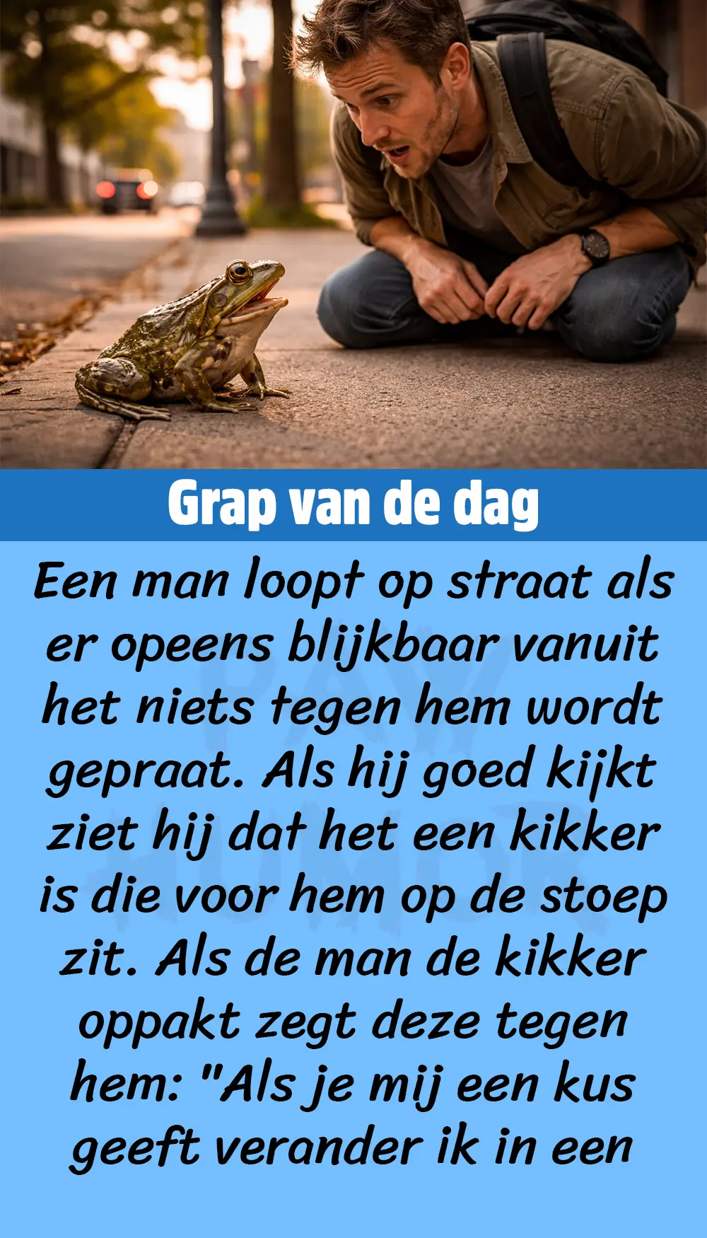 Maar de kikker begint opnieuw vreselijk te kwaken. De man haalt vervolgens de kikker weer uit zijn zak, de kikker begint direct te praten en zegt: “Echt geloof me, ik ben een bloedmooi wijf en als je mij een kus geeft dan zal ik altijd bij je blijven en dan mag je alles met me doen, wat je maar wilt!” De man kijkt even naar de kikker en stopt hem weer in zijn zak om daarna gewoon weer verder te lopen.