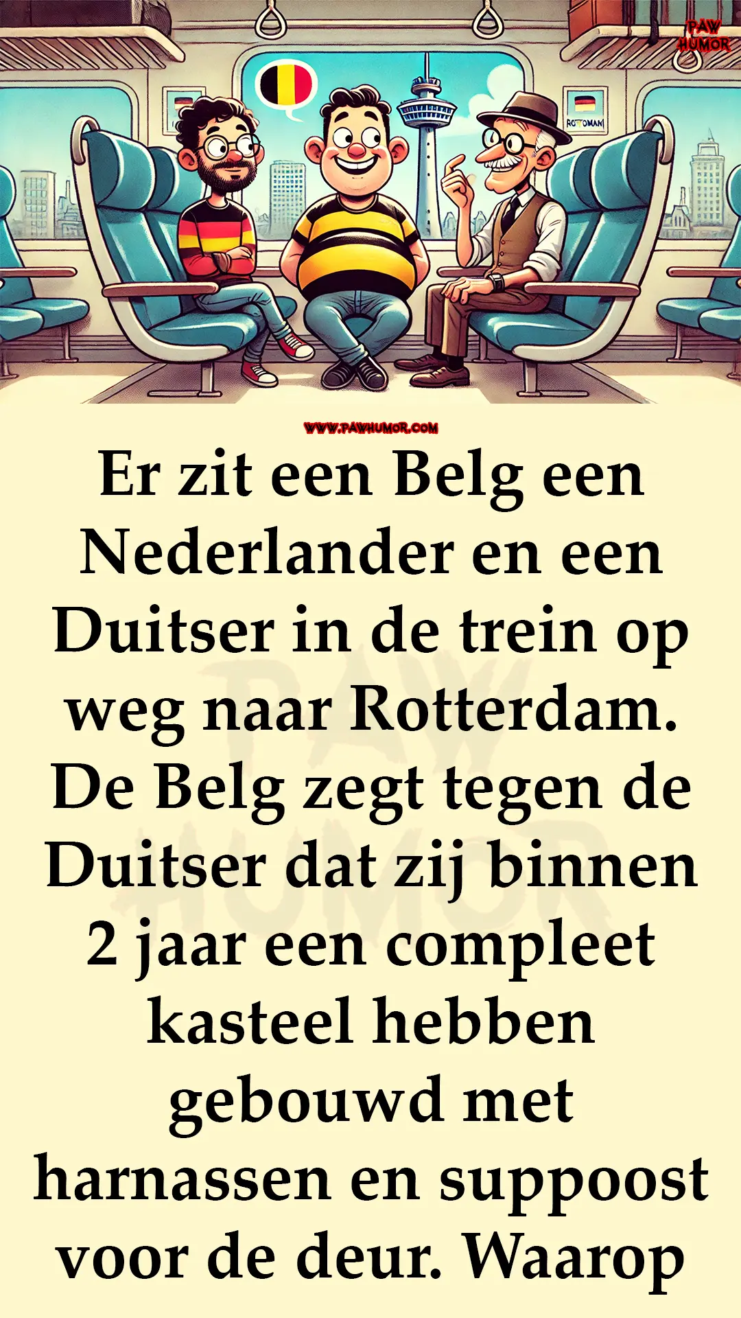 Waarop de Duitser tegen de Belg zegt dat dat nog niets is, want zij hebben een complete fabriek gebouwd met productlijn en afzetgebied in een jaar tijd. Na dit gezegd te hebben, komen ze in Rotterdam aan en zien ze de euromast daarop vragen ze de Nederlander wat dat is. De Nederlander die zegt:
