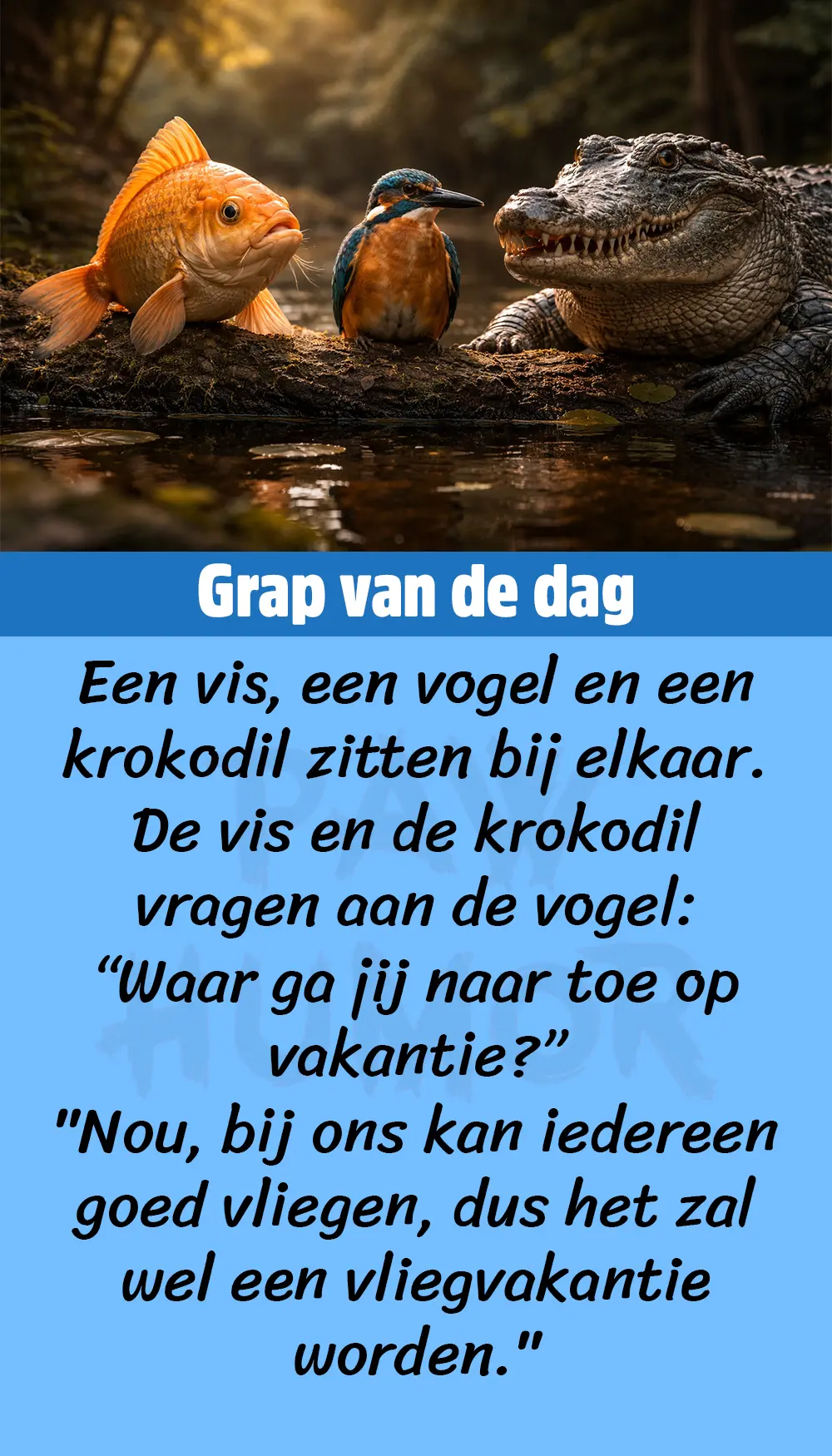 Dan vragen de vis en de vogel aan de krokodil: “Waar ga jij naar toe op vakantie?”