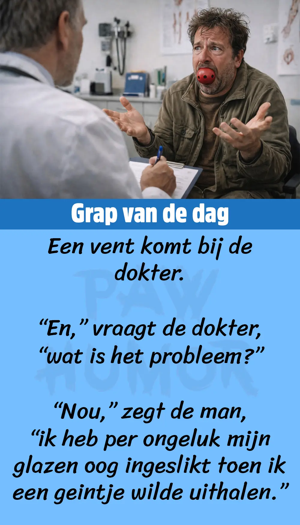 De dokter trekt zijn handschoen aan en begint te wurmen. Na een minuutje zegt hij: “Sorry, maar ik zie hem niet zitten.”
