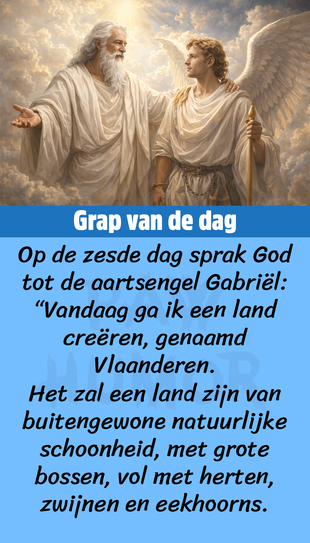 God ging verder: “Ik zal het land rijk maken door de landbouw en de inwoners zullen grote welvaart kennen. Ze zullen bekend worden als Vlamingen. En zullen het vriendelijkste volk op aarde zijn.”