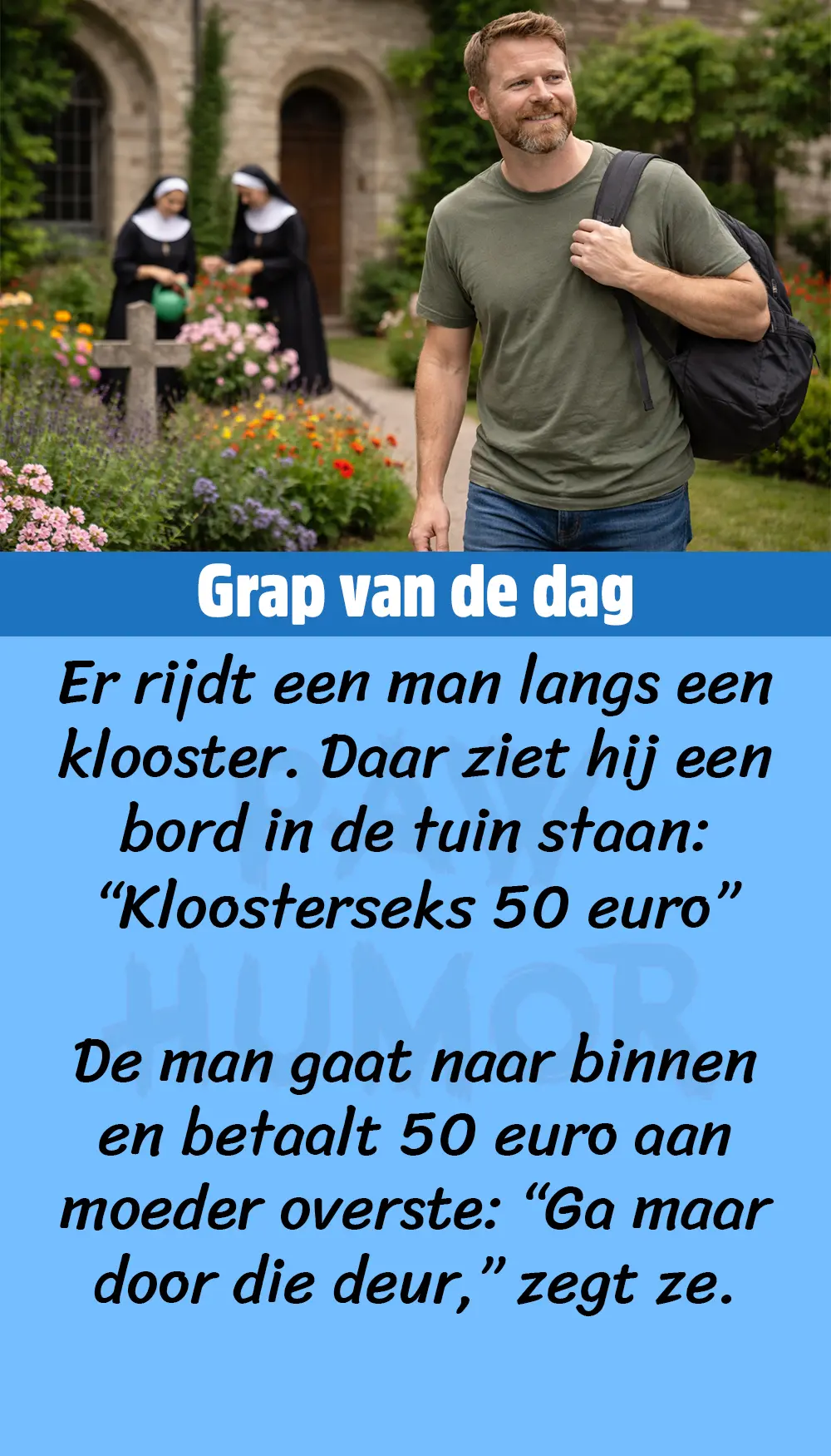 Er rijdt een man langs een klooster. Daar ziet hij een bord in de tuin staan: “Kloosterseks 50 euro”