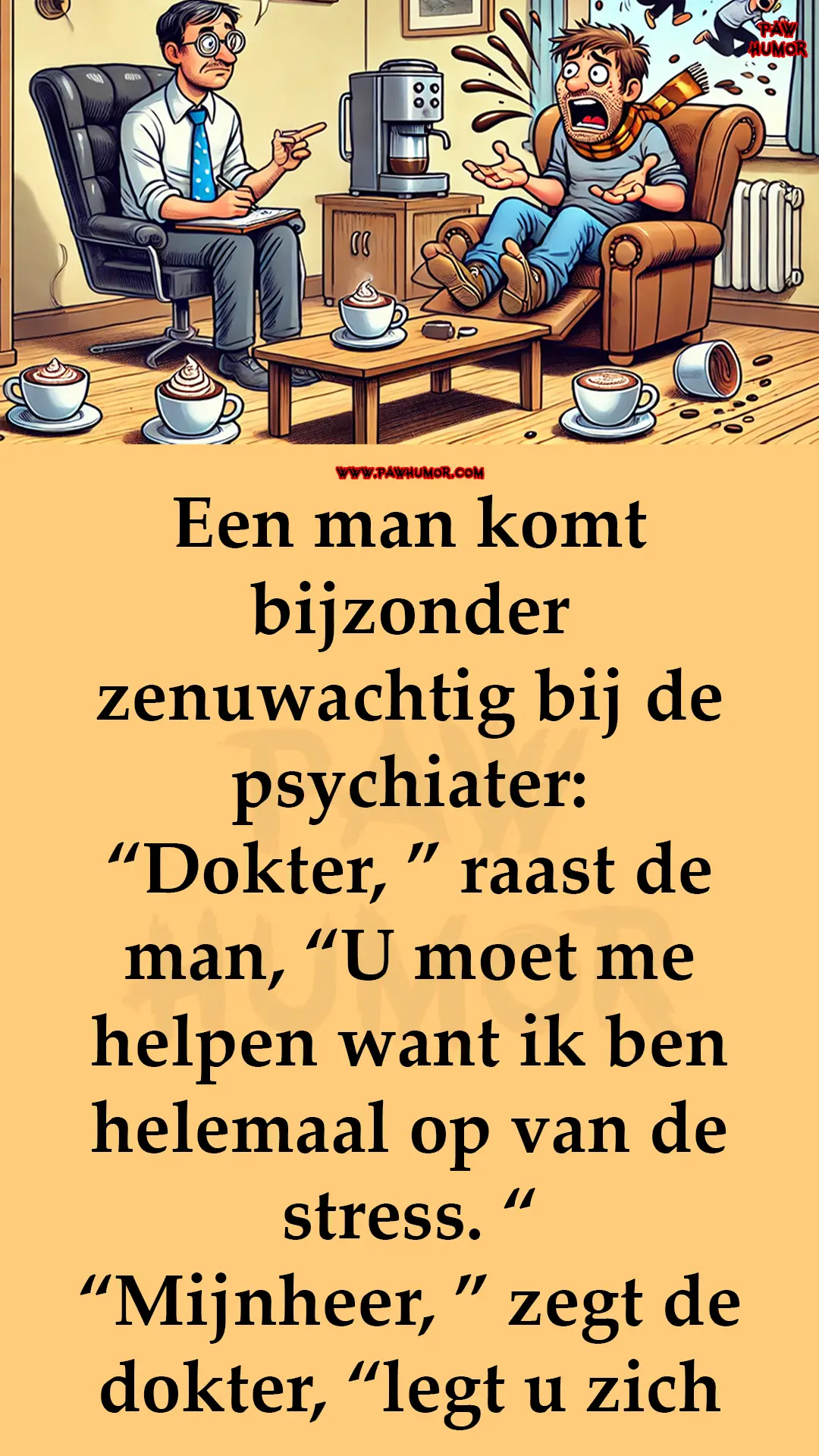 “Dat stomme wijf interesseert me geen reet, ” antwoordt de man, “maar zoveel koffie drinken kan toch nooit goed zijn voor mijn stress, hè dokter?”
