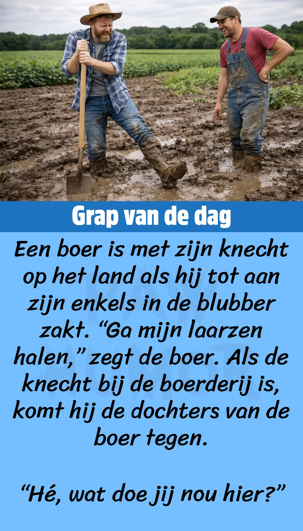 “Oh nee? Wacht maar, dan vraag ik het hem wel even,” en hij roept naar de boer op het land: “Moest ik er nou 1 pakken of 2?!”