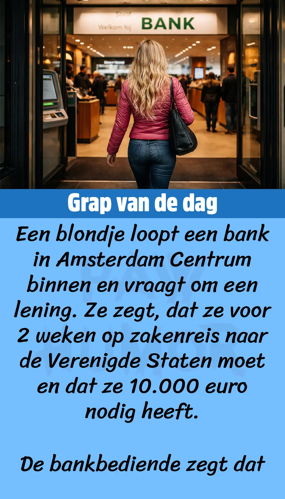 Na twee weken komt het blondje terug en betaalt netjes de lening terug, plus de rente van zo’n 45 euro. De bediende groet haar vriendelijk en zegt, dat ze blij waren zaken met haar te kunnen doen. Maar hij geeft aan, dat ze wel enigszins in verwarring zijn geraakt. Na haar vertrek hebben ze haar nog een keer nagetrokken en het bleek, dat ze multimiljonair is. Waarom wou ze in vredesnaam 10.000 euro lenen, terwijl ze zelf zo rijk is.