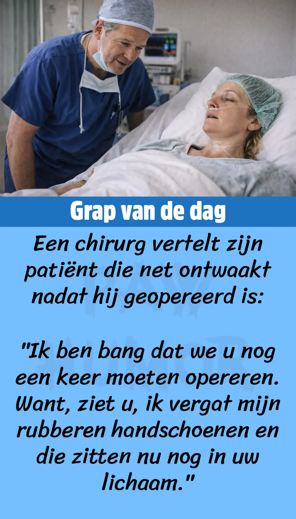 “Ik ben bang dat we u nog een keer moeten opereren. Want, ziet u, ik vergat mijn rubberen handschoenen en die zitten nu nog in uw lichaam.”