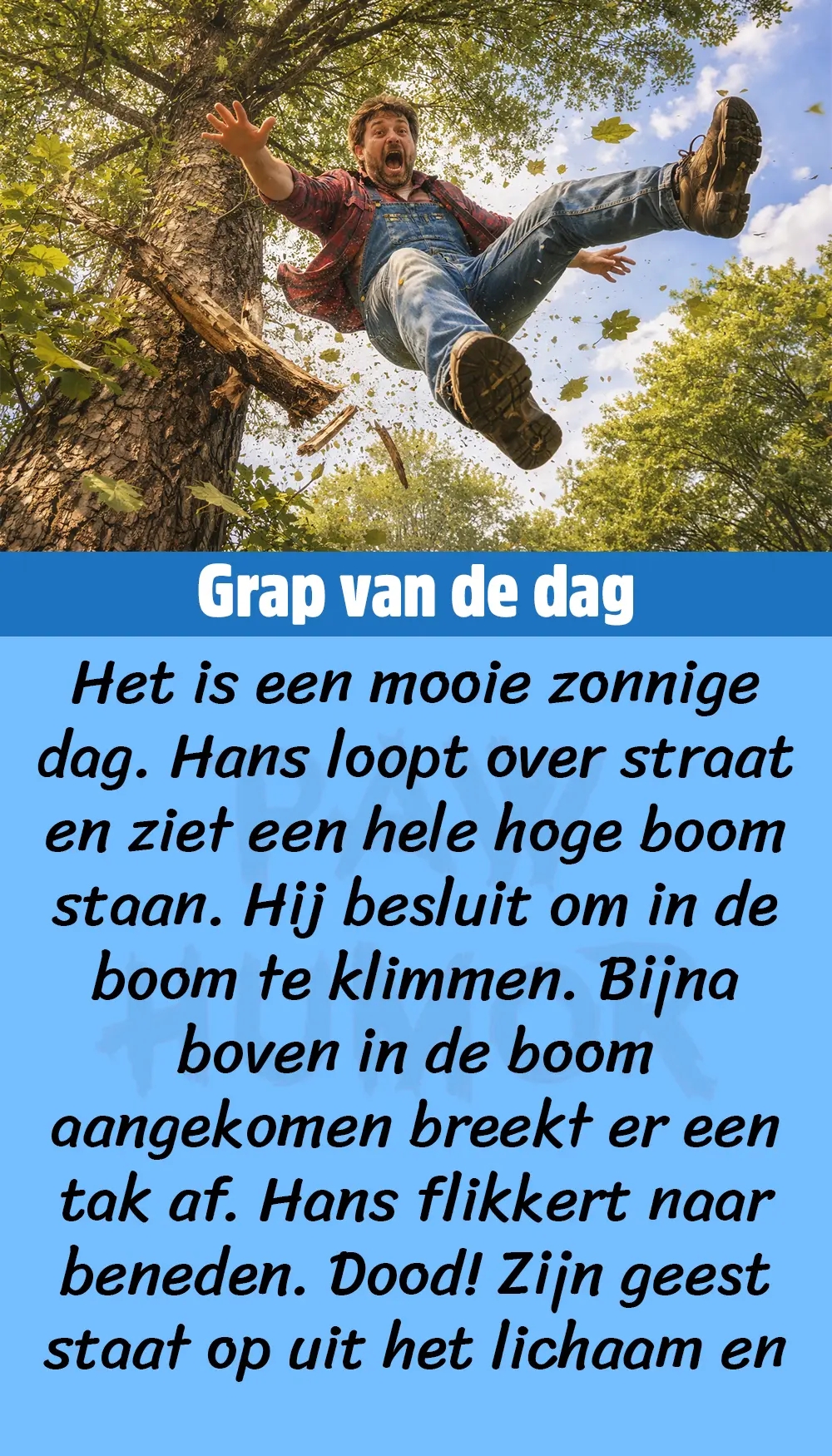 Zijn geest staat op uit het lichaam en reist naar de hemelpoort. Daar aangekomen ziet hij Petrus bij de poort staan. Petrus zegt: “Zo Hans wat doe jij hier? Het is je tijd nog niet!”