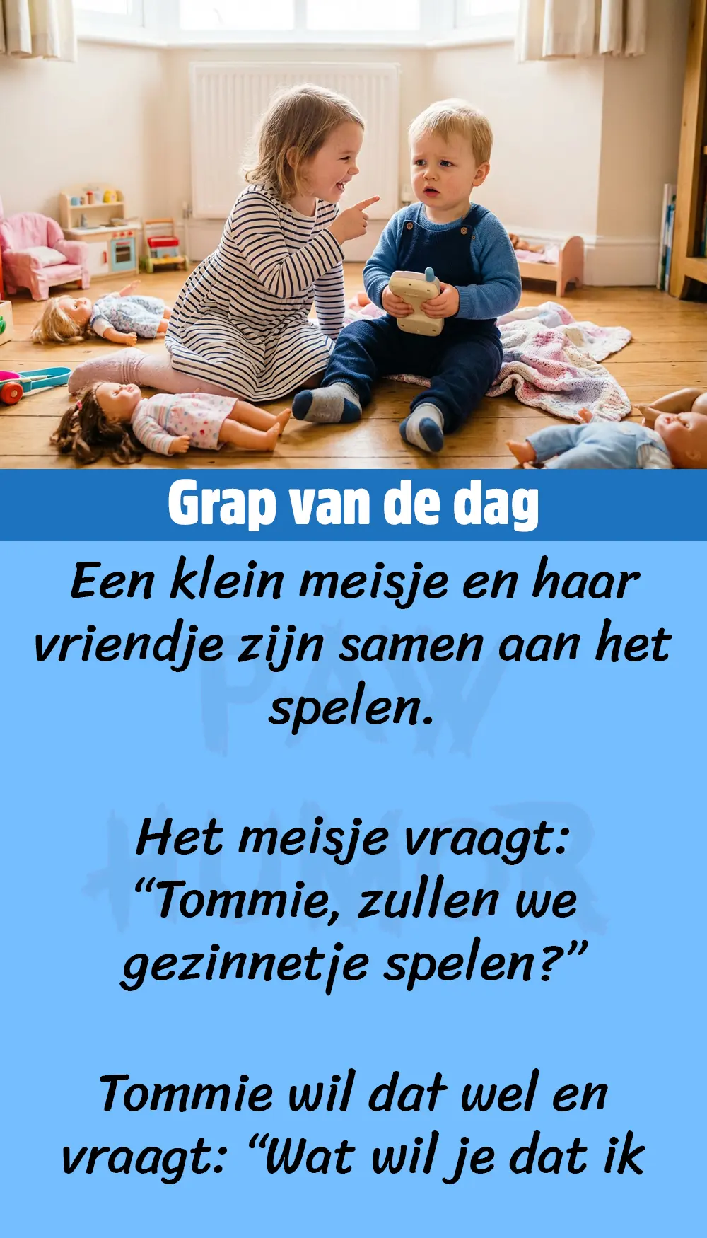 Het meisje vraagt: “Tommie, zullen we gezinnetje spelen?”