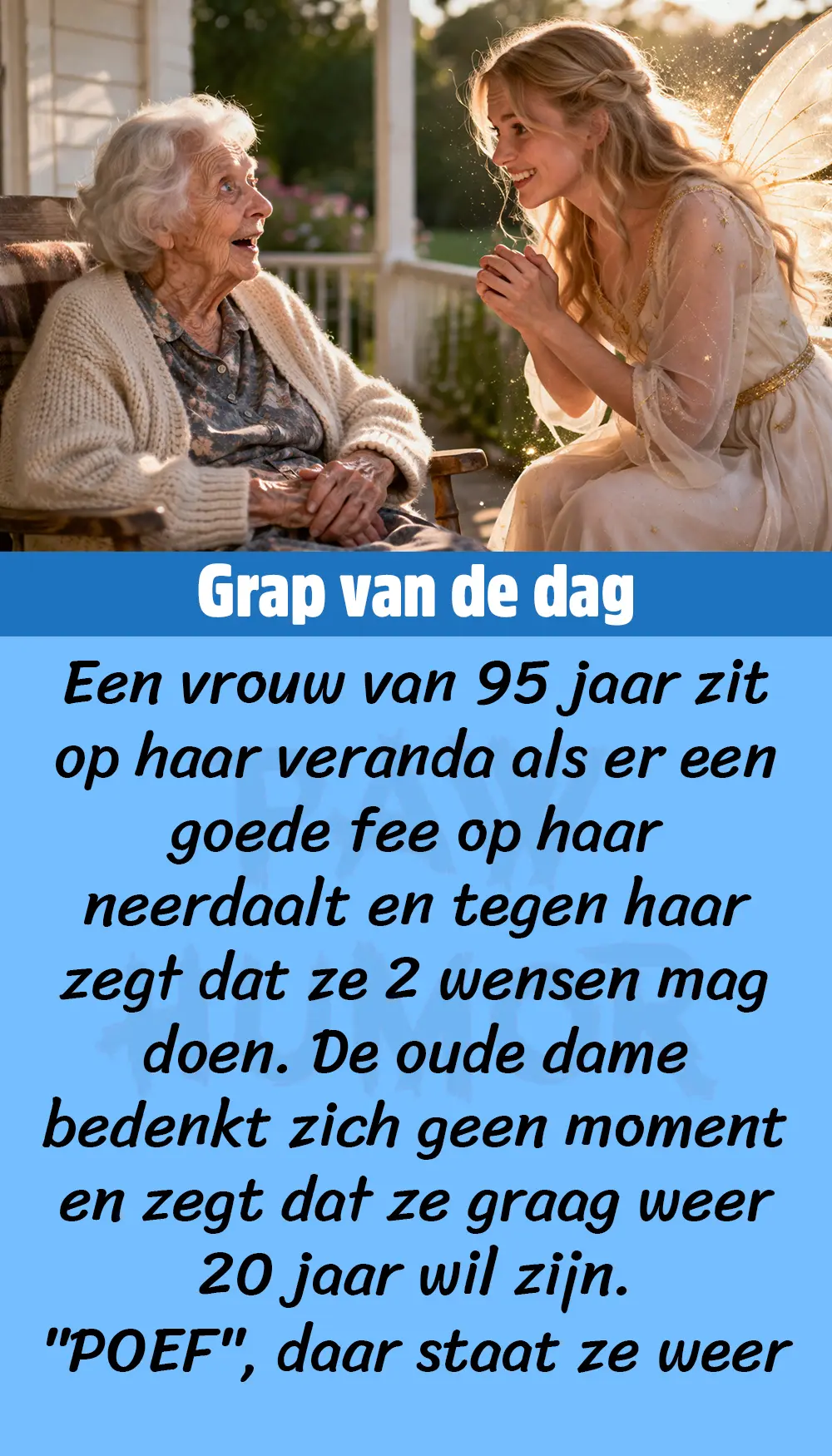 “POEF”, daar staat ze weer als een mooie jonge blom. De tweede wens is wat moeilijker, tot haar oude kater er aan komt lopen en haar kopjes geeft. Ze zegt tegen de fee dat ze als tweede wens wil dat haar oude kater een mooie jonge man zal worden.