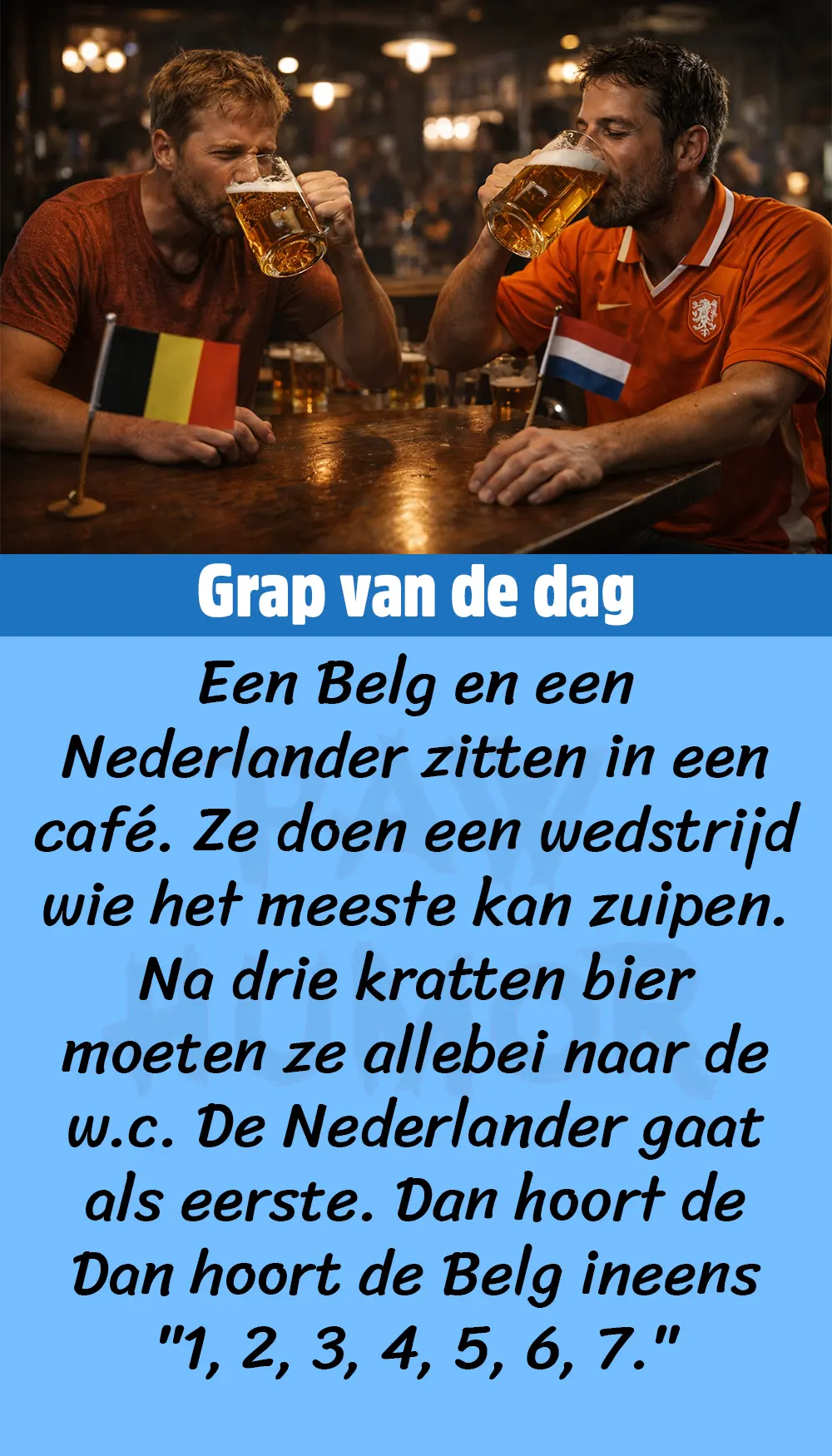 Dan gaat de Belg naar het toilet. Hoort de Nederlander opeens: “1, 2, 3, 5, 3, 5, 3, 5, 3, 5, 3, 5, 3, 5.”