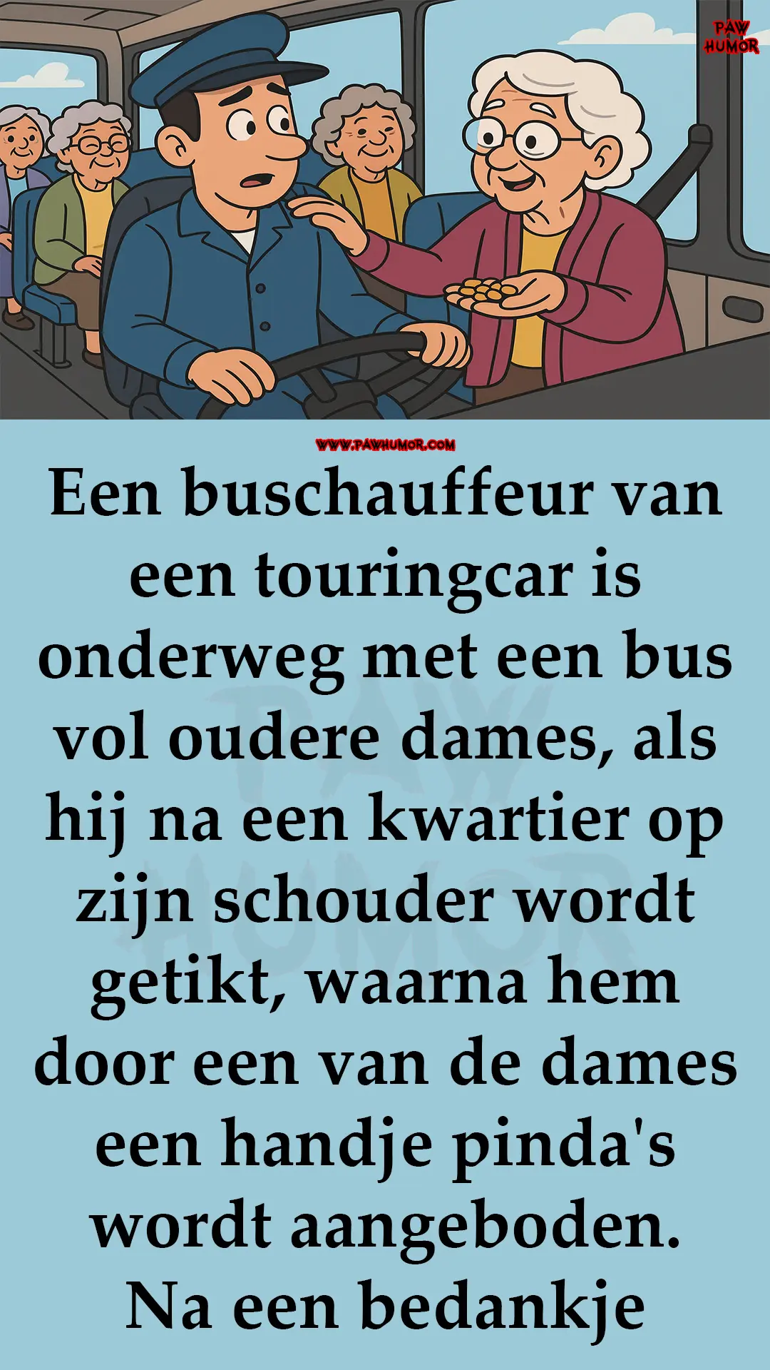 Na weer een kwartier staat er een andere dame achter hem met een handje pinda’s.